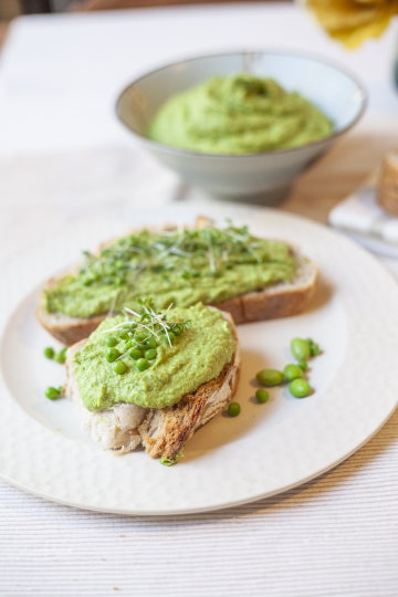 2. Blancheer de doperwten en de edamame bonen 2 minuten, koel af in ijswater en laat uitlekken.