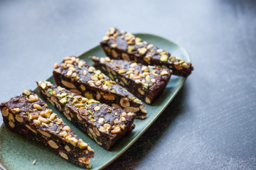 4. Hak een klein handje pistachenoten en pijnboompitten en verdeel dit over het beslag. Zet de panforte in de oven en bak in 20 minuten gaar.